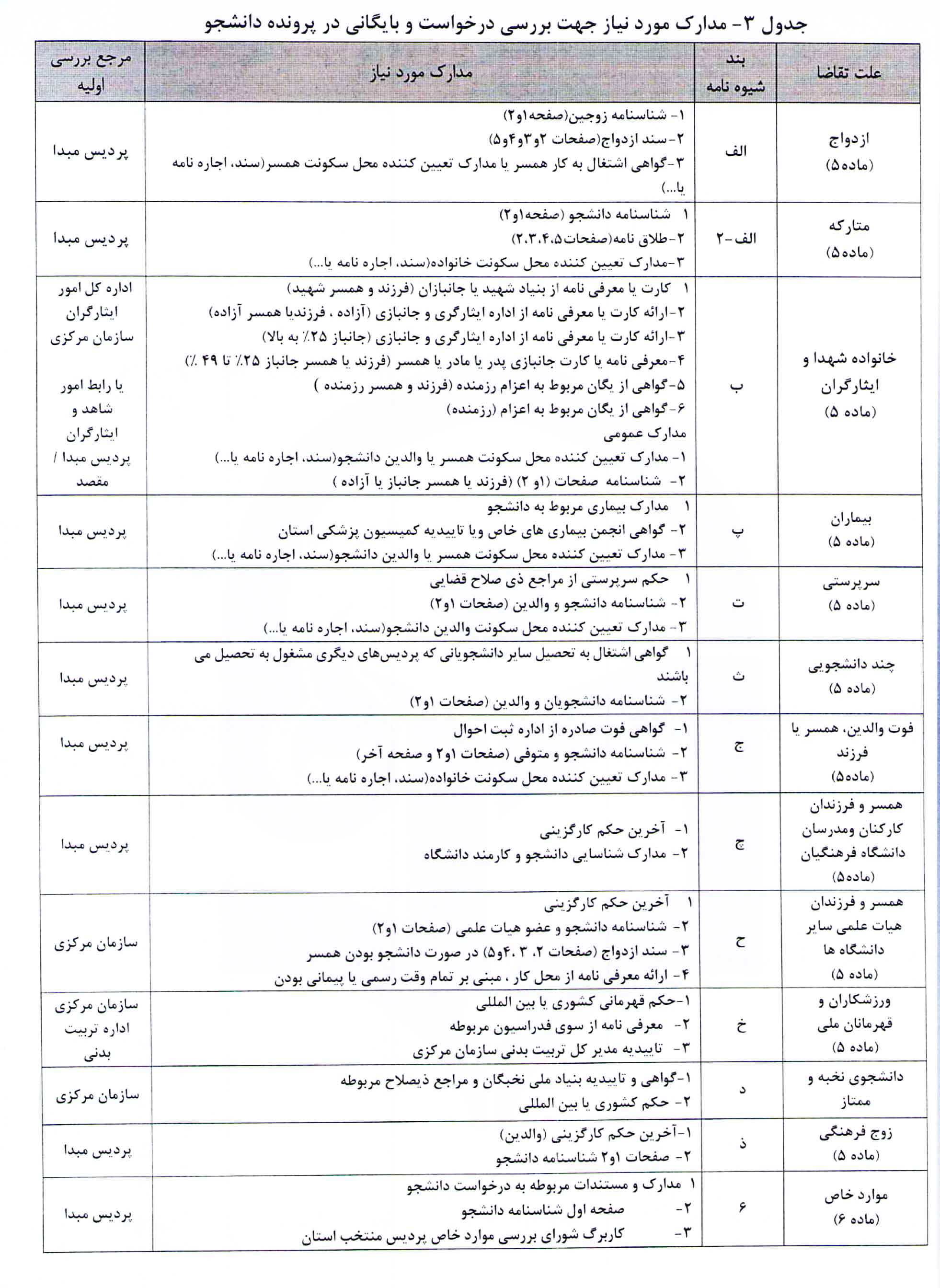 ۲-- مستندات خود را بر اساس جدول ۳ شیوه نامه در سامانه بارگذاری (به صورت فیزیکی) به حوزه اموردانشجویی پردیس/مرکز مبدأ (در صورت قبولی درخواست) جهت بایگانی در پرونده تحصیلی دانشجو ارائه نماید.
