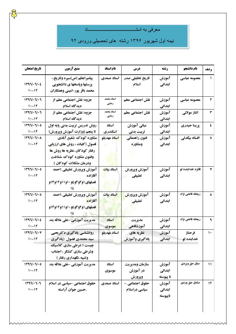 دانشجویان محترم کارشناسی پیوسته ورودی 92 وکارشناسی نا پیوسته ورودی 95 که در نیمه اول شهریور ماه (4 تا 8 شهریور 96) آزمون دروس معرفی به استاد دارند، جهت اطلاع از " منابع درسی و تاریخ امتحان " به برنامه مندرج در ضمیمه مراجعه فرمایند.