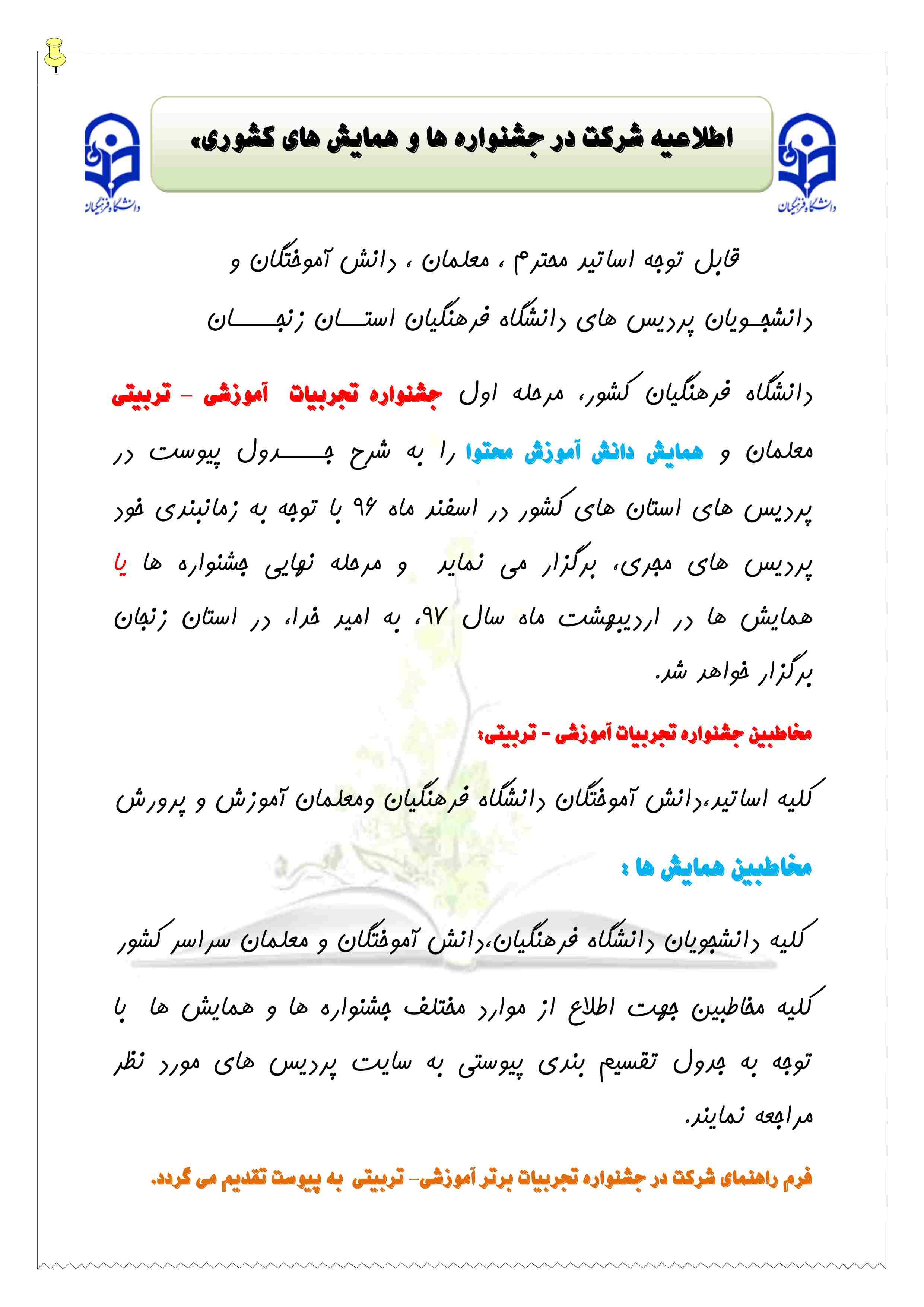 تمامی اساتید ، دانش آموختگان دانشگاه فرهنگیان و معلمان آموزش و پرورش جهت دریافت فرم ارائة گزارش برای جشنوارة تجربیات برتر، به پیوست مراجعه نمایند.