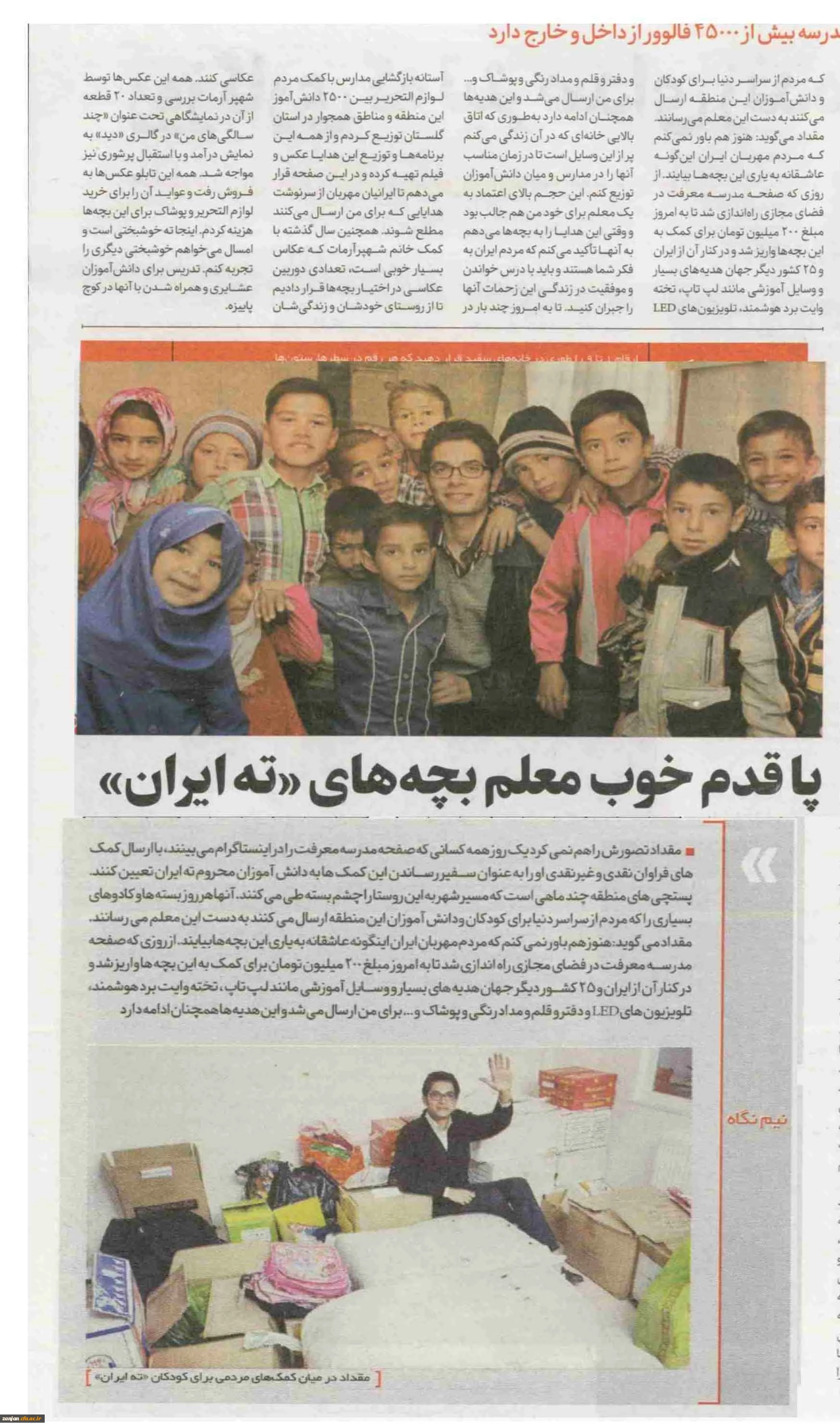 روزنامه ایران گزارش داد: نو معلم ورودی 1391 دانشگاه فرهنگیان با صفحه اینستاگرامش سفیر کمک به دانش آموزان محروم ایرانی شد 2