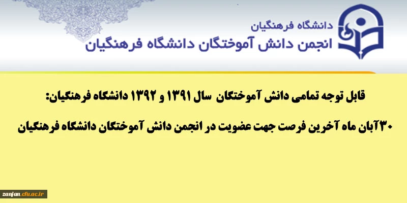قابل توجه تمامی دانش آموختگان سال 1391 و 1392 دانشگاه فرهنگیان: 30آبان ماه آخرین فرصت جهتعضویت در نجمن دانش آموختگان دانشگاه فرهنگیان 2
