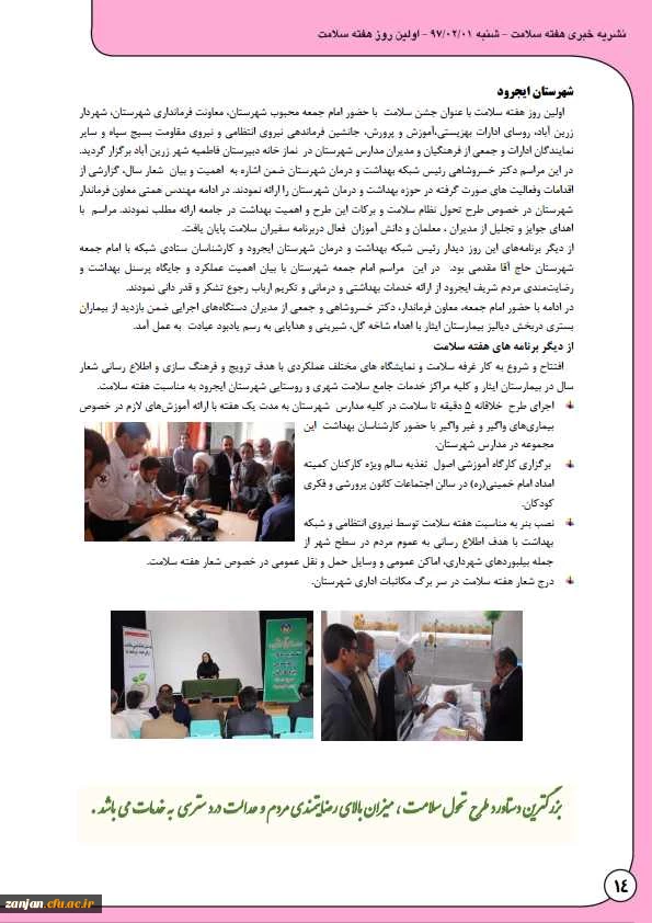 امتیاز دهید : به مناسبت هفته بهداشت و سلامت منتشر شد: نشریه خبری هفته سلامت 15 دوشنبه 3 اردیبهشت 1397 ساعت 8:15
