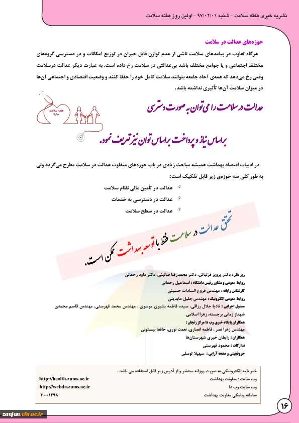 امتیاز دهید : به مناسبت هفته بهداشت و سلامت منتشر شد: نشریه خبری هفته سلامت 17 دوشنبه 3 اردیبهشت 1397 ساعت 8:15