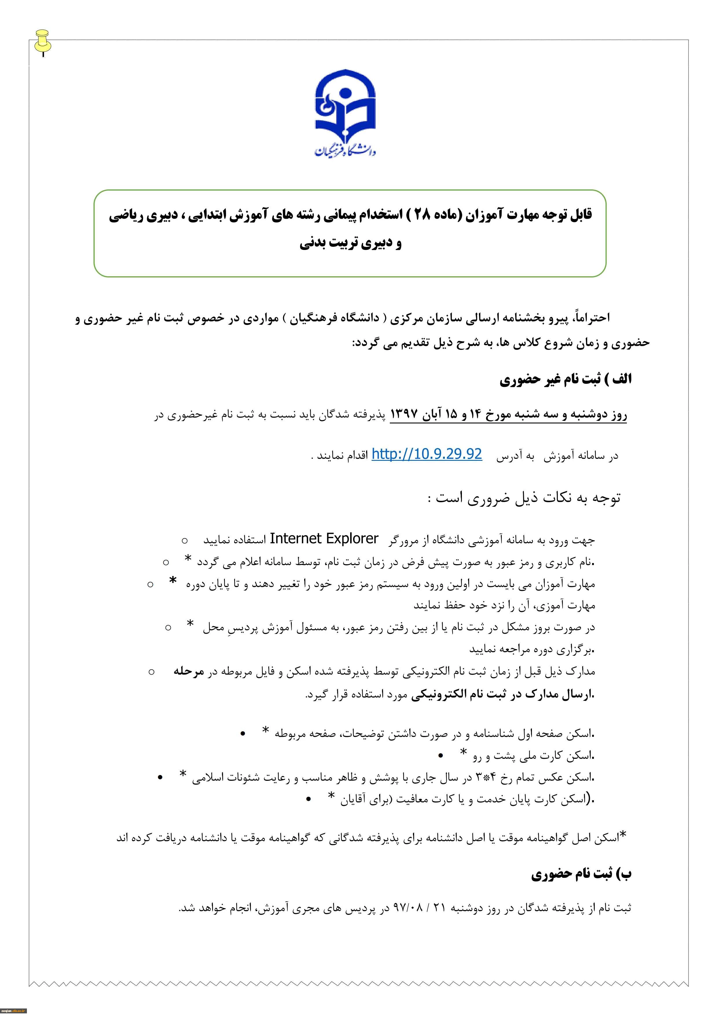 قابل توجه مهارت آموزان (ماده 28 ) استخدام پیمانی ورودی 97 : زمان و مکان ثبت نام حضوری و غیر حضوری و زمان تشکیل کلاس های درس 2