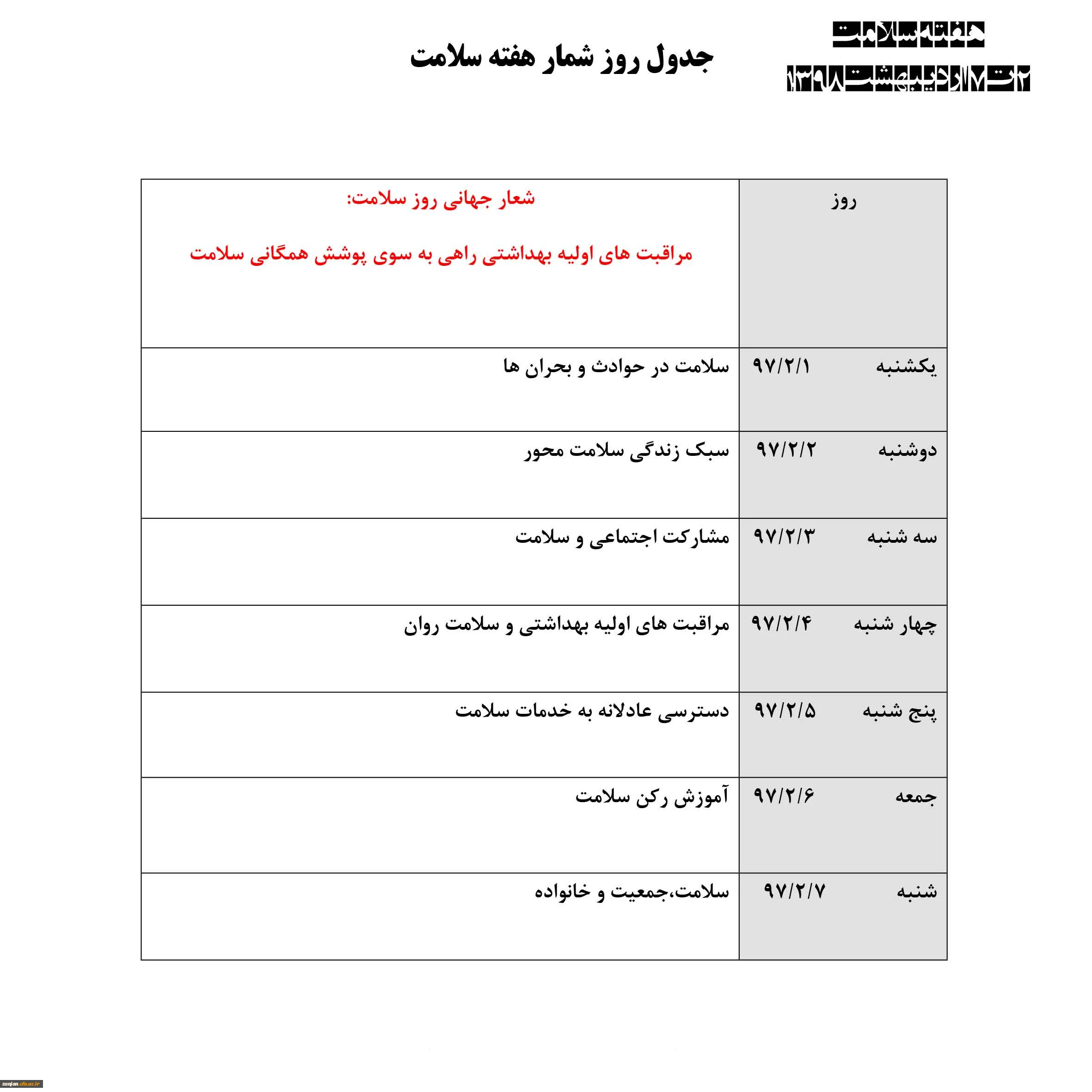 با همکاری اداره بهداشت شهرستان زنجان و دانشگاه فرهنگیان استان زنجان برگزار می شود: 2 تا 7 اردیبهشت1398 اجرای برنامه های برنامه های هفته سلامت 2