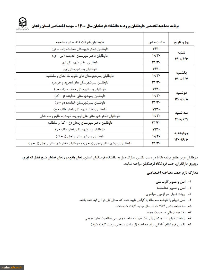 برنامه مصاحبه تخصصی داوطلبان ورود به دانشگاه فرهنگیان سال 1400 – سهمیه اختصاصی استان زنجان 4