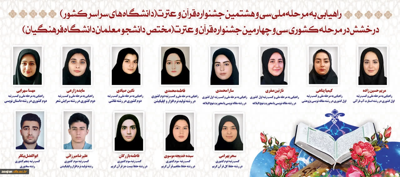 راهیابی هشت نفر از دانشجو معلمان پردیس الزهرا(س)زنجان به مرحله ملی سی و هشتمین جشنواره قرآن و عترت دانشگاه های سراسر کشور 2