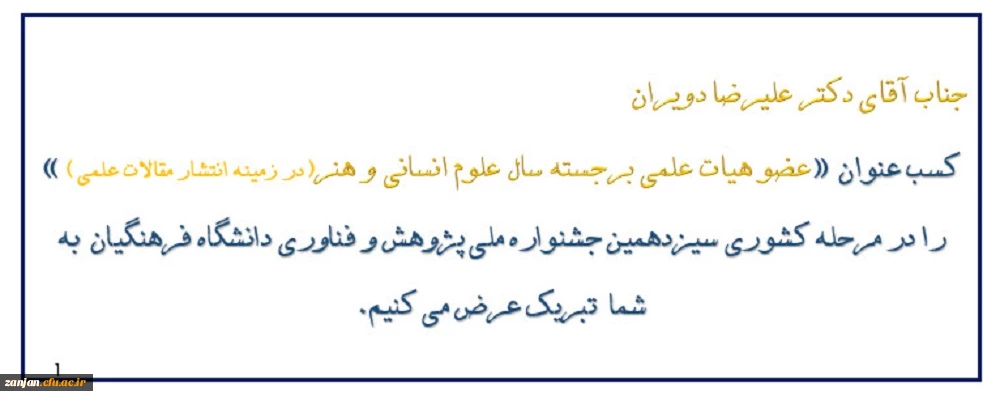 دکتر علیرضا دویران موفق به کسب عنوان «عضو هیات علمی برجسته سال علوم انسانی و هنر(در زمینه انتشار مقالات علمی)» در مرحله کشوری سیزدهمین جشنواره ملی پژوهش و فناوری دانشگاه فرهنگیان شد. 2